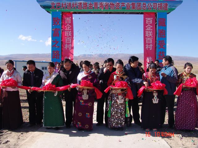 交接儀式上,集團公司總經(jīng)理王玉輝、共和縣人大常委會主任尕瑪才讓為元者村黨員活動室、科普文化室、醫(yī)療衛(wèi)生室揭牌之后,與黨委書記白家林、紀委書記王仁芬、共和縣委常委、組織部長官卻南見等領導為共和縣黑馬河鄉(xiāng)文巴村進村道路通車剪彩。集團公司黨委書記白家林代表省物產(chǎn)集團向共和縣江西溝鄉(xiāng)提前捐送元者村游牧民定居點工程配套資金100,000元。集團公司紀委書記王仁芬、共和縣委常委、組織部長官卻南見、江西溝鄉(xiāng)元者村村長、文巴村村長分別代表捐建方、受捐方致辭發(fā)言。至此,青海物產(chǎn)集團在"百企聯(lián)百村"活動中擬投入的1,455,500元,已到位1,255,500元。剩余的200,000元游牧民定居點工程建設項目捐款將根據(jù)工程進度分期轉(zhuǎn)付。